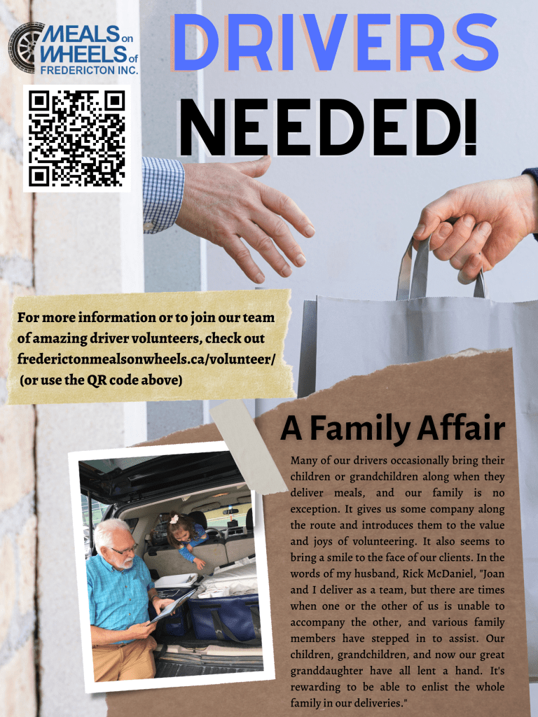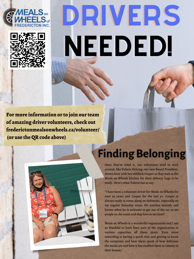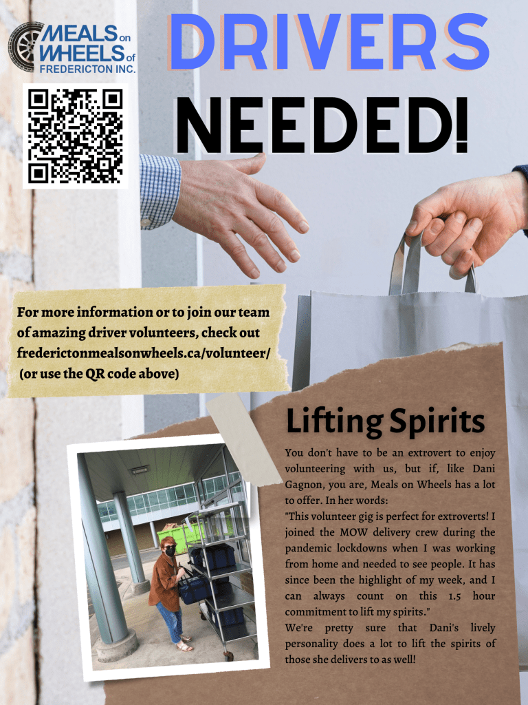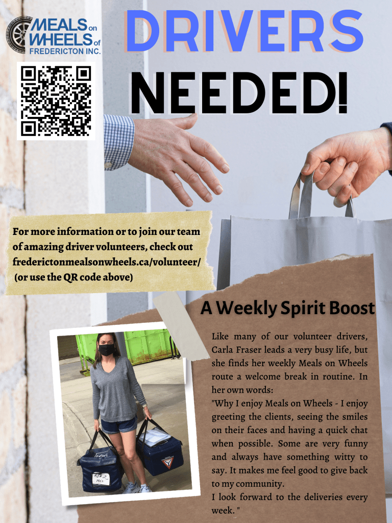 If you would like to join our wonderful team, click here for more information and a link to our application form, or contact us by telephone at 458-9482, or by email at drivers@frederictonmealsonwheels.ca